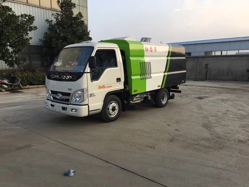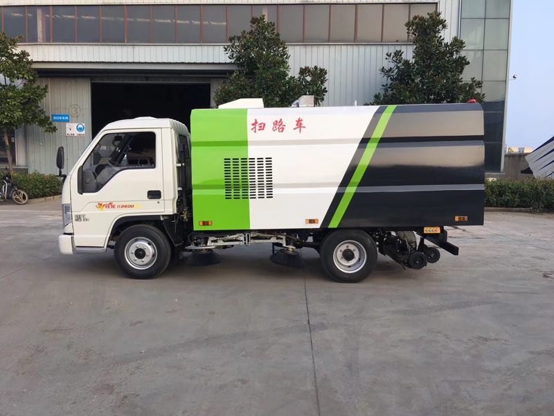 該掃路車采用福田小卡型二類底盤改裝,加裝副發動機、風機、清水箱、垃圾箱、左右立掃、后置吸盤,掃盤降塵系統,液壓系統、專用裝置電控系統和副車架等改裝而成。