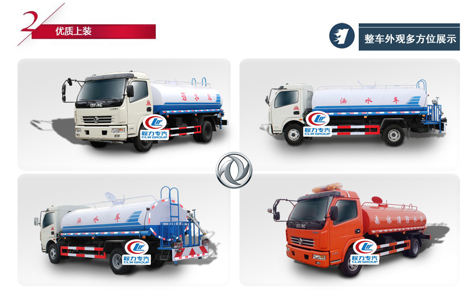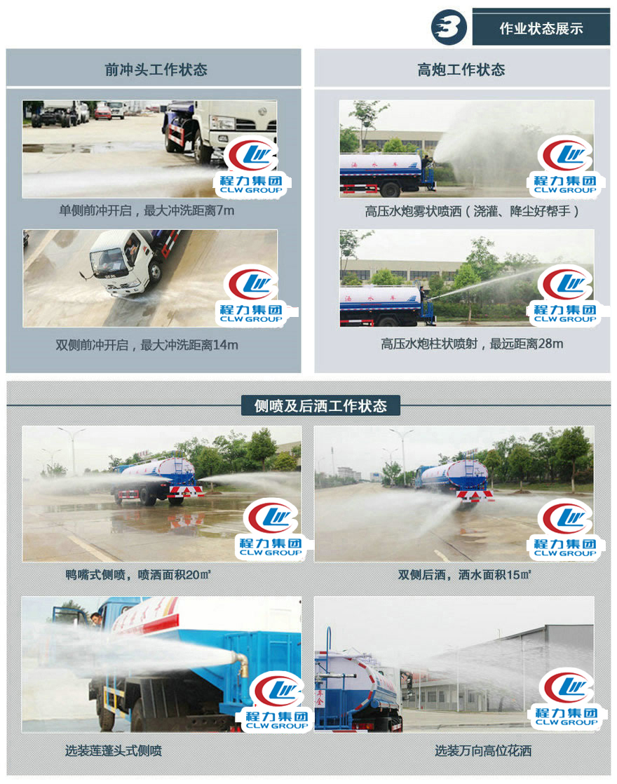 改裝配置:罐體采用4mm厚武鋼專用容積板制作,實(shí)際標(biāo)準(zhǔn)容積10立方,罐內(nèi)隔板具有防波作用,以減低汽車行駛時(shí)罐體液體的沖擊。泵 進(jìn)泵出,消防栓接口,前沖、后灑、側(cè)噴、后工作平臺(tái)帶綠化水炮,垂直吸程≧7米,灑水寬度≧14-16米,射程≧20-25米,引水時(shí) 間<5min,流量90m3/h。自流閥、濾網(wǎng)、帶自吸自排功能。兩根等長(zhǎng)輸水管,金屬漆,其余標(biāo)配。可加裝藥盤、氣動(dòng)控制閥、噴藥設(shè)備、非車帶泵動(dòng)力等。