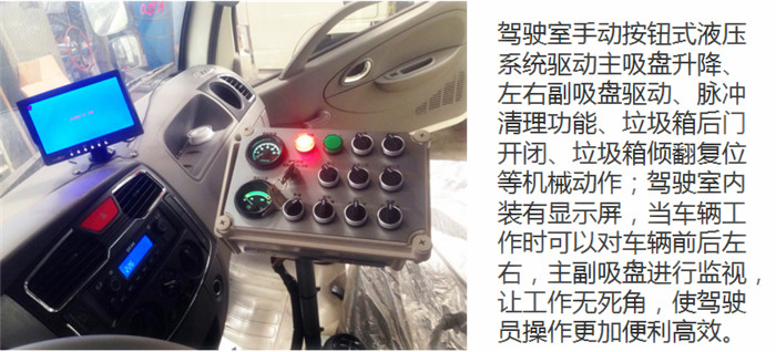 2.操縱便捷。只需要通過駕駛室內(nèi)的控制面板就可方便的操作副發(fā)動(dòng)機(jī)啟動(dòng)和熄火、風(fēng)機(jī)轉(zhuǎn)速升降、吸塵口升降、后門開關(guān)、箱體升降,灑水開關(guān)。