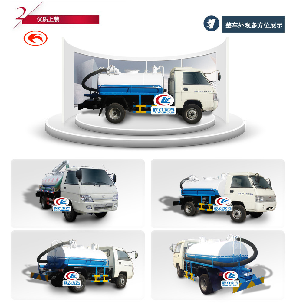 福田時代小卡之星2方小型吸糞車罐體采用機器壓板一次性成型技術,采用先進旋邊機,罐體包罐機工藝保證了罐體制作的精度和美觀。全國獨有烤漆工藝,防腐除銹,多層底漆、面漆噴涂。主要為城鄉環衛部門抽吸和運送糞便及其它污水。適用于抽吸糞便,污水、污泥漿和混有較小懸浮雜物的液體,適用于市政環衛、大中小型工礦企業,小區、學校,化糞池清理轉運,城市管道清理疏通,工廠沼液沼渣清理等。