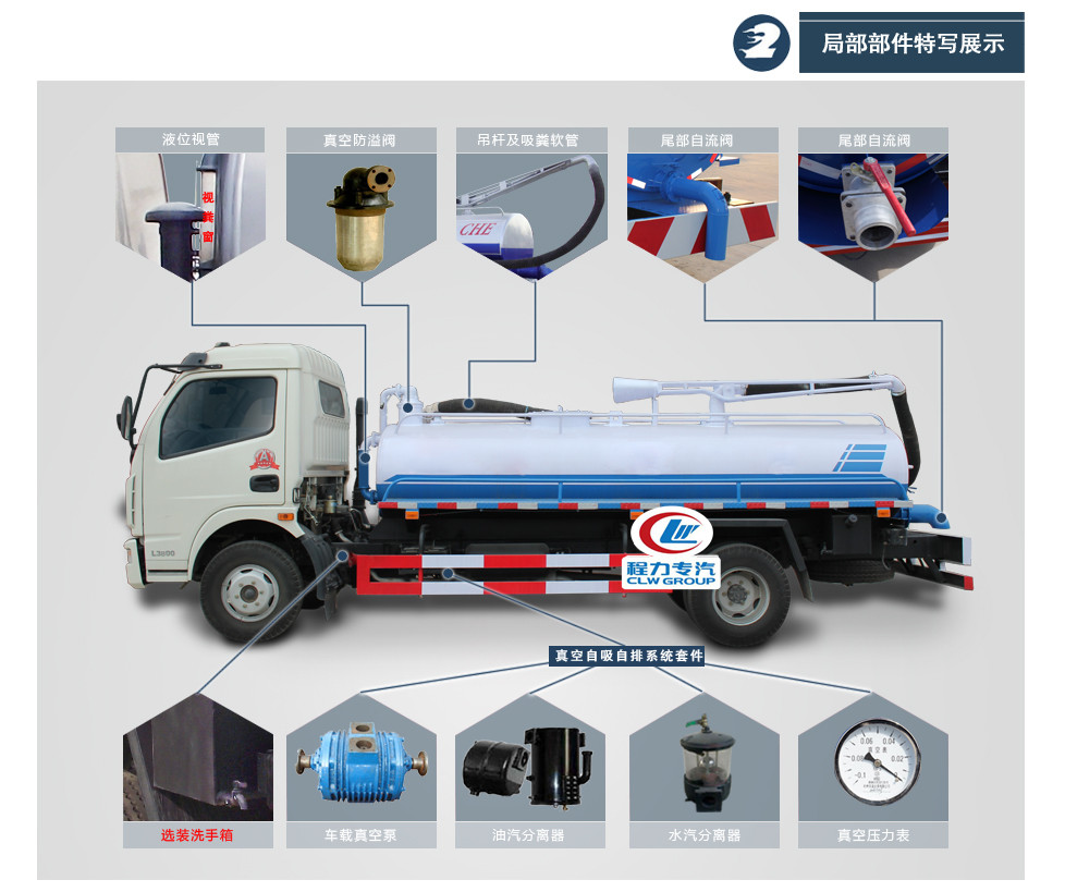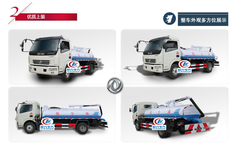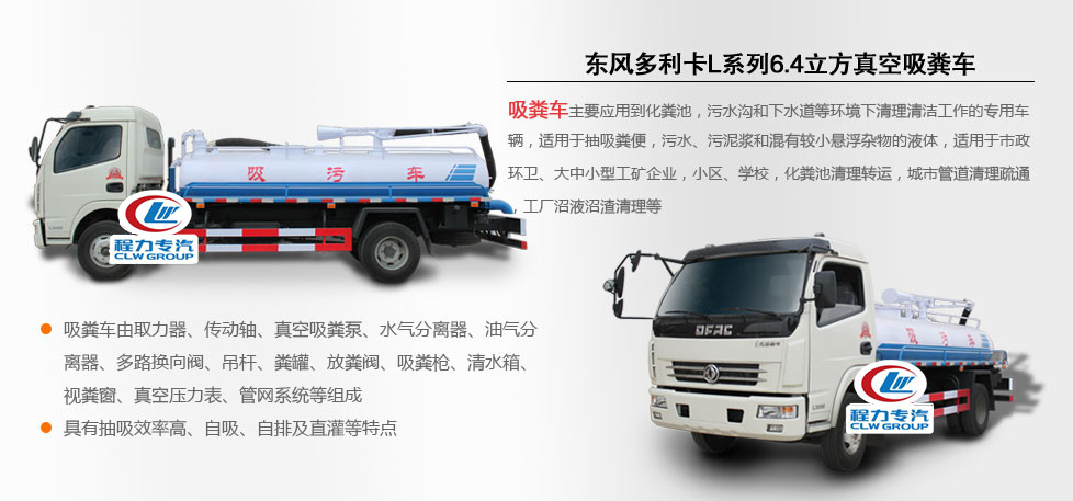 東風大多利卡吸污車罐體形狀為圓柱形,采用武鋼6mm厚優質碳鋼鋼板,罐體前部帶吸污窗,洗手裝置,舉升裝置,吸污管5米一根,罐體多種顏色選擇,其余按廠內標準配置制作。隨車配置大功率真空吸污泵和優質液壓系統,罐體封頭一次壓鑄成型、罐體可后開、雙頂自卸。罐內污物可通過后蓋直接傾倒,具有真空度高(比吸糞車的吸力更大)、噸位大、效率高、用途更廣泛的特點。(垂直吸程:≥8 m,工作壓力:8500Pa,理論抽速:97L/S,軸功功率:≤10kw,進排氣口徑:50mm,抽滿罐時間:<5 min,排滿罐時間:<4min。吸污車采用大功率真空泵,一次壓鑄成型的封頭-,加厚的抗壓罐體,雙頂液壓系統,是比吸糞車功能更強大的車型。