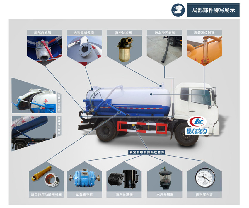 專用功能:吸污車專用部分由取力器、傳動軸、真空吸污泵、壓力罐體、液壓部分,管網(wǎng)系統(tǒng)、真空壓力表、視糞窗、洗手裝置等組成,隨車配置大功率真空吸污泵和優(yōu)質液壓系統(tǒng),罐體封頭一次壓鑄成型、罐體可后開、雙頂自卸。罐內(nèi)污物可通過后蓋直接傾倒,具有真空度高(比吸糞車的吸力更大)、噸位大、效率高、用途更廣泛的特點。