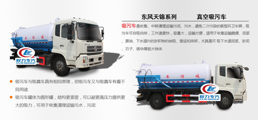 東風(fēng)天錦吸污車罐體形狀為圓柱形,采用武鋼6mm厚優(yōu)質(zhì)碳鋼鋼板,罐體前部帶吸污窗,洗手裝置,舉升裝置,吸污管5米一根,罐體多種顏色選擇,其余按廠內(nèi)標(biāo)準(zhǔn)配置制作。隨車配置大功率真空吸污泵和優(yōu)質(zhì)液壓系統(tǒng),罐體封頭一次壓鑄成型、罐體可后開、雙頂自卸。罐內(nèi)污物可通過后蓋直接傾倒,具有真空度高(比吸糞車的吸力更大)、噸位大、效率高、用途更廣泛的特點(diǎn)。(垂直吸程:≥8 m,工作壓力:8500Pa,理論抽速:120L/S,軸功功率:≤13kw,進(jìn)排氣口徑:50mm,抽滿罐時(shí)間:<5 min,排滿罐時(shí)間:<4min。吸污車采用大功率真空泵,一次壓鑄成型的封頭-,加厚的抗壓罐體,雙頂液壓系統(tǒng),是比吸糞車功能更強(qiáng)大的車型。