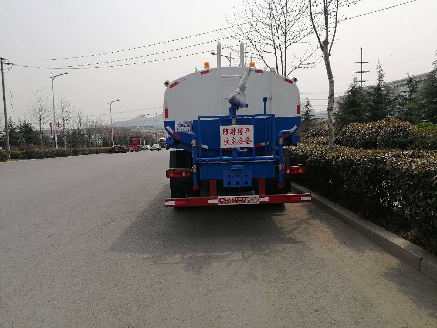 東風153底盤,康明斯190馬力,陜齒小八檔變速箱, 10.00鋼絲胎,罐體容積15m3,帶專用車灑水泵,帶消防接口,自流閥,帶右高位花灑,帶前沖、后灑、工作平臺及高炮,罐體噴“灑水車”字樣,其他按廠家標配。